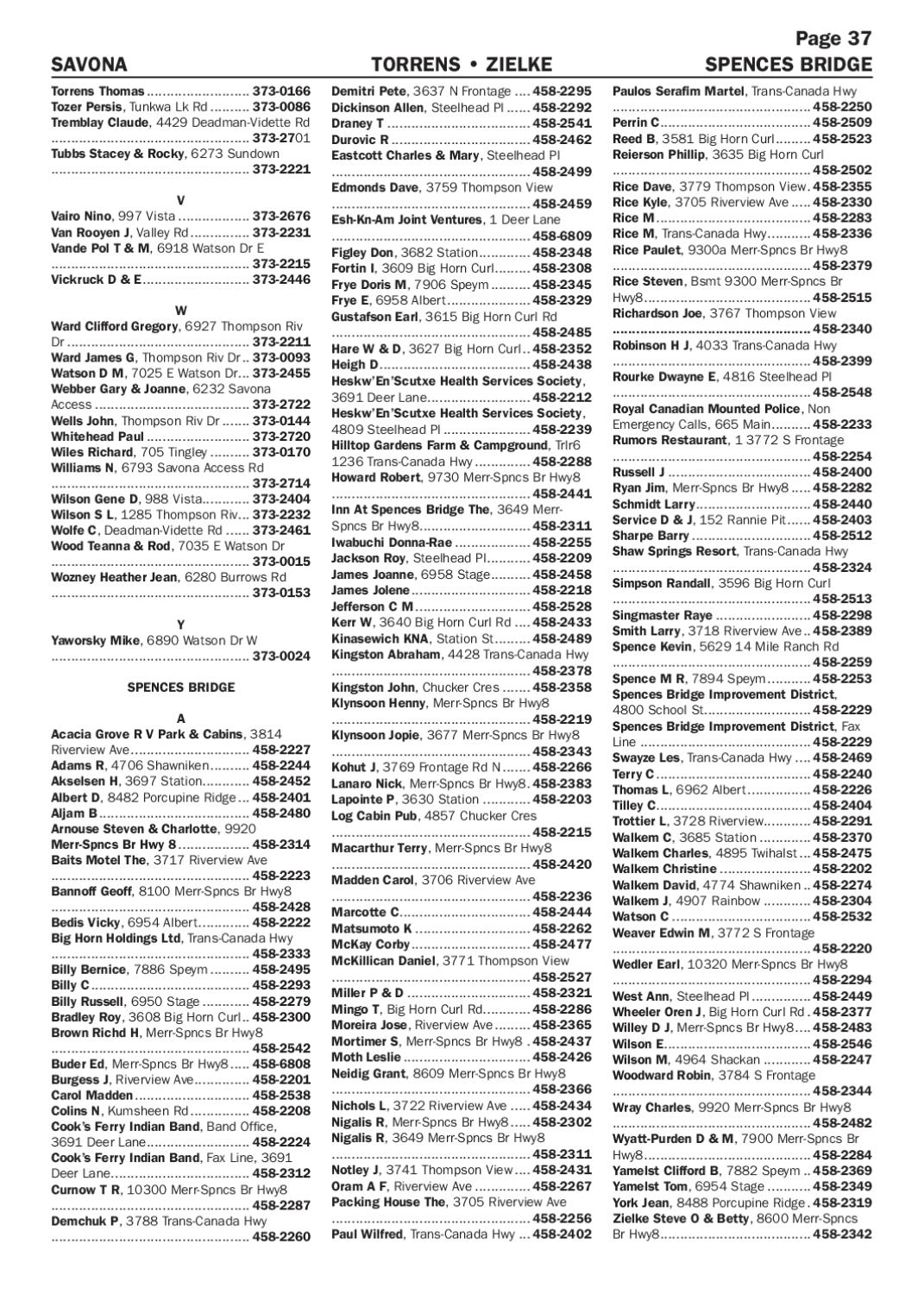 SAVONA Torrens Thomas........................... 373-0166 Tozer Persis, Tunkwa Lk Rd........... 373-0086 Tremblay Claude, 4429 Deadman-Vidette Rd. .................................................. 373-2701 Tubbs Stacey & Rocky, 6273 Sundown .................................................. 373-2221 V Vairo Nino, 997 Vista................... 373-2676 Van Rooyen J, Valley Rd................ 373-2231 Vande Pol T & M, 6918 Watson Dr E .................................................. 373-2215 Vickruck D & E............................ 373-2446 W Ward Clifford Gregory, 6927 Thompson Riv Dr............................................... 373-2211 Ward James G, Thompson Riv Dr... 373-0093 Watson D M, 7025 E Watson Dr... 373-2455 Webber Gary & Joanne, 6232 Savona Access........................................ 373-2722 Wells John, Thompson Riv Dr........ 373-0144 Whitehead Paul........................... 373-2720 Wiles Richard, 705 Tingley........... 373-0170 Williams N, 6793 Savona Access Rd .................................................. 373-2714 Wilson Gene D, 988 Vista............. 373-2404 Wilson S L, 1285 Thompson Riv.... 373-2232 Wolfe C, Deadman-Vidette Rd....... 373-2461 Wood Teanna & Rod, 7035 E Watson Dr .................................................. 373-0015 Wozney Heather Jean, 6280 Burrows Rd .................................................. 373-0153 Y Yaworsky Mike, 6890 Watson Dr W .................................................. 373-0024 SPENCES BRIDGE A Acacia Grove R V Park & Cabins, 3814 Riverview Ave............................... 458-2227 Adams R, 4706 Shawniken........... 458-2244 Akselsen H, 3697 Station............ 458-2452 Albert D, 8482 Porcupine Ridge.... 458-2401 Aljam B....................................... 458-2480 Arnouse Steven & Charlotte, 9920 Merr-Spncs Br Hwy 8................... 458-2314 Baits Motel The, 3717 Riverview Ave .................................................. 458-2223 Bannoff Geoff, 8100 Merr-Spncs Br Hwy8 .................................................. 458-2428 Bedis Vicky, 6954 Albert.............. 458-2222 Big Horn Holdings Ltd, Trans-Canada Hwy .................................................. 458-2333 Billy Bernice, 7886 Speym........... 458-2495 Billy C......................................... 458-2293 Billy Russell, 6950 Stage............. 458-2279 Bradley Roy, 3608 Big Horn Curl... 458-2300 Brown Richd H, Merr-Spncs Br Hwy8 .................................................. 458-2542 Buder Ed, Merr-Spncs Br Hwy8...... 458-6808 Burgess J, Riverview Ave............... 458-2201 Carol Madden.............................. 458-2538 Colins N, Kumsheen Rd................ 458-2208 Cook’s Ferry Indian Band, Band Office, 3691 Deer Lane........................... 458-2224 Cook’s Ferry Indian Band, Fax Line, 3691 Deer Lane.................................... 458-2312 Curnow T R, 10300 Merr-Spncs Br Hwy8 .................................................. 458-2287 Demchuk P, 3788 Trans-Canada Hwy .................................................. 458-2260