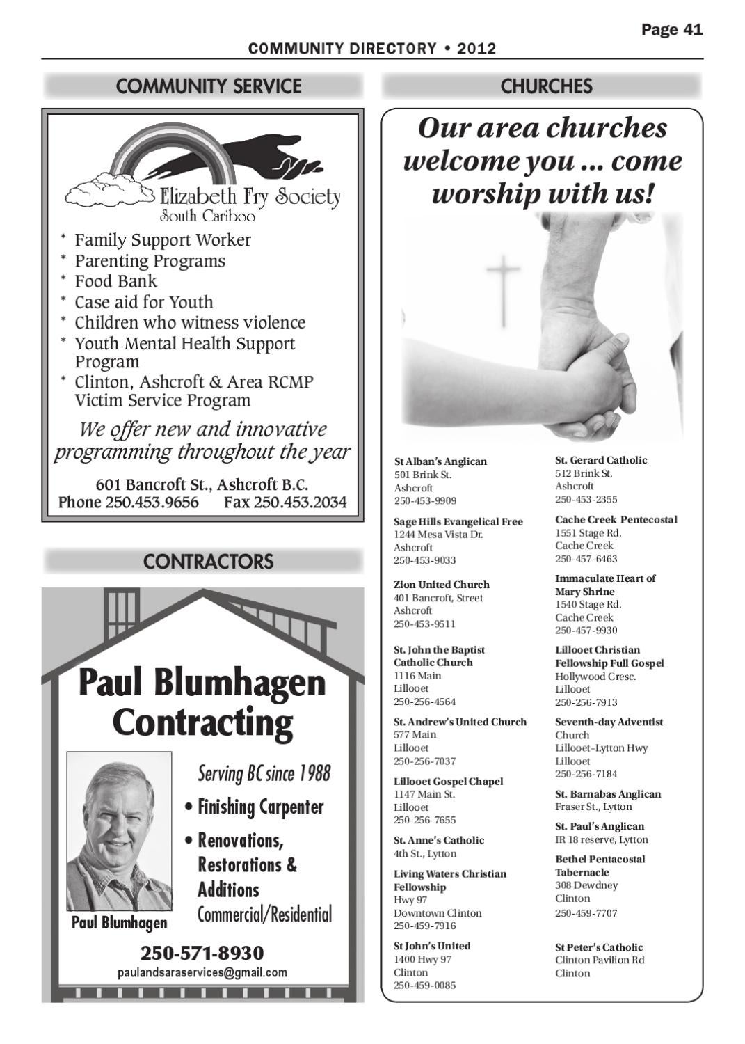 St. Barnabas Anglican Fraser St., Lytton St. Paul’s Anglican IR 18 reserve, Lytton Bethel Pentacostal Tabernacle 308 Dewdney Clinton 250-459-7707 St Peter’s Catholic Clinton Pavilion Rd Clinton