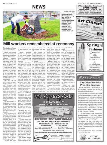 Monica Lamb-Yorski Tribune Staff Writer During the National Day of Mourning ceremony held at the cenotaph in Williams Lake Saturday, organizer Eric Freeston called out the names of the four mill workers recently killed in Burns Lake and Prince George. Afterwards he said it is unfortunate that ceremonies to remember those who have died in the workplace have to take place each year because it would be better if there had been no deaths at all. “But the sad reality is that workplace deaths continue to occur,” Freeston said, adding people working in forestry, mining, and restaurants and even those driving taxis, are subject to injury and it’s necessary to remember people who have lost their lives and pay tribute to their sacrifices on the job. The National Day of Mourning is observed on April 28 in Canada to commemorate those injured, who have suffered illness or have died due to work-place hazards. First initiated by the Canadian Union of Public Employees in 1984, the Canadian Labour of Congress picked up on it the following year, and in 1990 it passed third reading at the federal legislation level and became a national day. Today it is observed in more than 80 countries in the world; however, Freeston said the observance hasn’t reduced the number of deaths. That number has been growing. “Health and safety