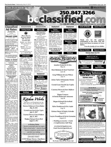 FaxFax 250-847-2995 847-2995 All All classifi classified ed and and classifi classified ed display display ads ads must must be be prepaid prepaid by by either either cash, debit, Visa or MasterCard. cash, debit, Visa or MasterCard. When phoning in ads, please When phoning in ads, please have have your your card card number number ready. ready. CLASSIFIED CLASSIFIED LINE/SEMI-DISPLAY LINE/SEMI-DISPLAY DEADLINE: DEADLINE: 11:00 11:00 a.m. a.m. on on the the Friday Friday preceding preceding publication. publication. CLASSIFIED DISPLAY AD CLASSIFIED DISPLAY AD DEADLINE: DEADLINE: 3:00 3:00 p.m. p.m. on on the the Thursday preceding publication Thursday preceding publication RATES start at at$10.95 $13.70++HST HSTforfor RATES start 3 3 lines a 1 week package (The lines perinweek. Interior News and The Northern Daily). ALL CLASSIFIED DEADLINES