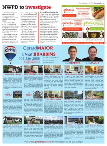School heads shuffle There will be some administrative shufÀing at a few New Westminster elementary schools when students arrive for classes in September. The movement was created with the appointment of Jacob Sol as district principal. Chris Evans will take over as principal at Richard McBride. Jenny Richter has been appointed principal of Connaught Heights to replace Evans. Her current position as vice-principal at John Robson will be ¿lled by Herbert Spencer vice-principal Paul Manville. Patti Peterson, currently a teacher at McBride, will take Manville’s position.