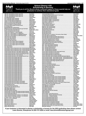 School District #28 Scholarship & Bursary Thank you to all the Donors whose continued support of these awards help our graduates to continue their educational goals 1950-1967 Scholarship/Bursary Reunion Legacy Fund ................................Sam Andrews 1950-1967 Scholarship/Bursary Reunion Legacy Fund ................................Allister Grapes 1950-1967 Scholarship/Bursary Reunion Legacy Fund ................................Scout Sameit Aaron Watkin Memorial Award .......................................................................Cameron Herman Arrow Transportation Systems Scholarship ...................................................Lucas Fox Arrow Transportation Systems Scholarship ...................................................Clarissa Wilkins Auxiliary to G.R. Baker Memorial Hospital Bursary .......................................Mahesh Dewan Auxiliary to G.R. Baker Memorial Hospital Bursary .......................................Amanda Schneider Barlow Creek Elementary School PAC Scholarship .......................................Thomas Christen Barlow Creek Volunteer Fire Department Bursary .........................................Ryley Macaulay BC Government Retired Employee Association Bursary ................................Erik Doerksen Be The Change Bursary ...................................................................................Courtney Mclaughlin Big Brothers/Big Sisters of Quesnel Bursary .................................................Megan Poole Bill Magnowski (Canyon Valley Ranch) Memorial Legacy Fund Award ........Brittany Raynor Bouchie Lake Elementary School PAC Award ................................................Rachelle Amelia La Riviere Bouchie Lake Elementary School PAC Award ................................................Jessica Lust Canadian Forest Products Ltd. - Quesnel Scholarship...................................Lacey Service Canadian Union of Public Employees Local 4990 Bursary.............................Savanna Kimmie Canadian Union of Public Employees Local 4990 Memorial Bursary ............Megan Poole Canadian Union of Public Employees Local 4990 Trades Bursary.................Mitchell Norman Cariboo Pulp & Paper Scholarship ..................................................................Carmen Morgan Cariboo Pulp & Paper Scholarship ..................................................................Daveen Panasar Cariboo Regional District Bursary ..................................................................Krystal Conway Cariboo Sikh Temple Society Award ...............................................................Cheryl Nordal Charles Froese Career Programs Award for Employment .............................Graham Howe Charles Froese Career Programs Award for Employment .............................Mikey McDonald Charles Froese Career Programs Award for Post Secondary ........................Jake Courtney Charles Froese Career Programs Award for Post Secondary ........................Chelsea Lupulack City of Quesnel Bursary ...................................................................................Vanessa Derksen City of Quesnel Bursary ...................................................................................Megan Poole Communications, Energy and Paperworkers Union of Canada Scholarship.Mitchell Norman Communications, Energy and Paperworkers Union of Canada Scholarship.Shaylyn Robertson Communications, Energy and Paperworkers Union of Canada Scholarship.Alysa Zavaglia Correlieu Secondary School Class of 2012 Athletic Department Award .......Shelby Gurney Correlieu Secondary School Class of 2012 Business Department Award .....Meghan Greenall Correlieu Secondary School Class of 2012 Fine and Performing Arts Award...Hope Kuhn Correlieu Secondary School Class of 2012 Scholarship ................................Scout Sameit Correlieu Secondary School Class of 2012 Technology Education Award ....Nicholas Runge Correlieu Secondary School Graduation Merit Award ...................................Sam Andrews Correlieu Secondary School Graduation Merit Award ...................................Zoe Cullinane Correlieu Secondary School Graduation Merit Award ...................................Caitlin Duckworth Correlieu Secondary School Graduation Merit Award ...................................Lyndsay Eby Correlieu Secondary School Graduation Merit Award ...................................Bron Finkelstein Correlieu Secondary School Graduation Merit Award ...................................Alexander Hackler Correlieu Secondary School Graduation Merit Award ...................................Victoria Jenkins Correlieu Secondary School Graduation Merit Award ...................................Allysha Lewis Correlieu Secondary School Graduation Merit Award ...................................Rupinder Lidder Correlieu Secondary School Graduation Merit Award ...................................Jordan Lindberg Correlieu Secondary School Graduation Merit Award ...................................Shaylnn McCauley Correlieu Secondary School Graduation Merit Award ...................................Torrye McKenzie Correlieu Secondary School Graduation Merit Award ...................................Teya Phinney Correlieu Secondary School Graduation Merit Award ...................................Shauna Regner Correlieu Secondary School Graduation Merit Award ...................................Lee Roodenburg Correlieu Secondary School Graduation Merit Award ...................................Shawn Sadler Correlieu Secondary School Graduation Merit Award ...................................Amrit Sekhon Correlieu Secondary School Graduation Merit Award ...................................Megan Smith Correlieu Secondary School Graduation Merit Award ...................................Sierra Stevens Correlieu Secondary School Graduation Merit Award ...................................Maughin Thideman Correlieu Secondary School G