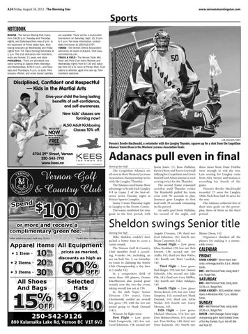 are available. There will be a round-robin tournament on Saturday, Sept. 15, 9 a.m. to 1 p.m. For more information, contact Wally Herrmann at 250-542-3797. TENNIS - The Vernon Tennis Association welcomes all levels of players. Visit www. vernontennis.com. TRACK & FIELD - The Vernon Triple AAA Track and Field Club trains Monday and Wednesday nights from 6-7:30 and Saturday from 10 a.m.-noon at Polson Park. Club caters to athletes aged nine and up. New members welcome.