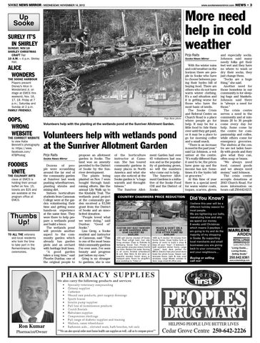propose an allotment garden in Sooke. The land was an amenity provided to the District of Sooke by the Sunriver development. The plants being planted on Nov. 7 were bought through fundraising efforts, like the annual Lily Walk up to the Kludahk Trail. The wetlands pond project at the community garden received a $3,500 grant from the District of Sooke and an unsolicited donation. “People loved what we were doing,” said Dunbar. “Good ol’ Sooke.” Lisa Greig, a Sooke resident and instructor at Camosun, said “This is one of the most beautiful community gardens I’ve ever seen. I’ve seen beauty and progress just before my eyes.” Grieg is no stranger to gardens, she is one