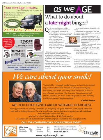 : My mom has Alzheimer’s and I’ve I am not sure if hiding everything edible is the moved her into my house while we wait solution. for a long term bed to come up. My I would suggest you think about at what time mom’s night-time behaviour is concerning she is having supper and if she has any substantial us—she sleepwalks and raids the kitchen snack before going to bed. every night hunting for Perhaps in anticipation of her sugary substances. We have interrupted sleep (which is part of moved everything to our the disease) you can put a fruit and basement fridge, but she still fibre bar out on the table for her manages to root out things midnight snack. Eve Silverman in our kitchen fridge (ate I found I was occasionally getting all the ketchup and seafood up at night starving. sauce). Any creative ideas Then I saw a Dr. Oz show and on what we can do ? he recommended a bowl of steel-cut oatmeal and
