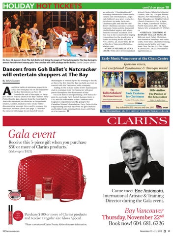 mythical battle of miniature proportions could very well play out on the main floor of the Bay Downtown on Nov. 22. Towards the end of the night, as shoppers bask in holiday cheer at the Bay’s annual Party Perfect beauty gala, dancers from the Goh Ballet’s Nutcracker ensemble (in character as Gingerbread soldiers, candies, malicious mice et al.) will be disseminating amongst the crowd to promote the timeless Christmas classic (see page 7). Whether Ad-Bay-Vancouver-Gala-Nov15.pdf 1 12-11-13 the dancers will engage in any Land of Sweets
