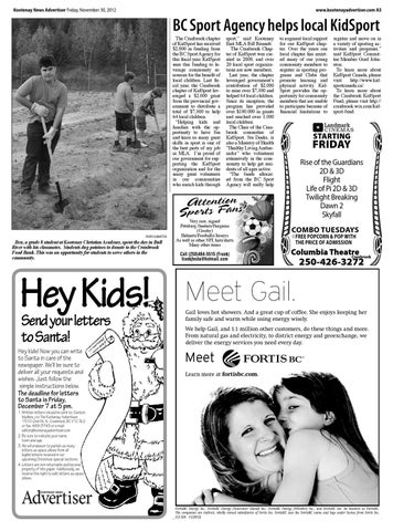 1. Written letters should be sent to: Santa’s Mailbox, c/o The Kootenay Advertiser, 1510-2nd St. N., Cranbrook, BC V1C 3L2 or fax: 489-3743 or e-mail: editor@kootenayadvertiser.com 2. Be sure to indicate your name, town and age. 3. We will endeavor to publish as many letters as space allows from all legible letters received in our upcoming Christmas special sections. 4. Letters are non-returnable and become property of this paper. Additionally, we reserve the right to edit letters as space allows.