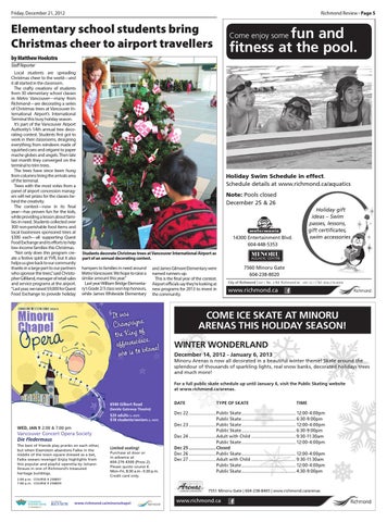 by Matthew Hoekstra Staff Reporter Local students are spreading Christmas cheer to the world—and it all started in the classroom. The crafty creations of students from 30 elementary school classes in Metro Vancouver—many from Richmond—are decorating a series of Christmas trees at Vancouver International Airport’s International Terminal this busy holiday season. It’s part of the Vancouver Airport Authority’s 14th annual tree decorating contest. Students first got to work in their classrooms, designing everything from reindeers made of squished cans and origami to paper mache globes and angels. Then late last month they converged on the terminal to trim trees. The trees have since been hung from columns lining the arrivals area of the terminal. Trees with the most votes from a panel of airport concession managers will net prizes for the classes behind the creativity. The contest—now in its final year—has proven fun for the kids, while providing a lesson about families in need. Students collected over 300 non-perishable food items and local businesses sponsored trees at $300 each—all supporting Quest Food Exchange and its efforts to help low-income families this Christmas. “Not only does this program create a festive spirit at YVR, but it also helps us give back to our community thanks in a large part to our partners who sponsor the trees,” said Christopher Gilliland, manager of retail sales and service programs at the airport. “Last year, we raised $9,000 for Quest Food Exchange to provide holiday