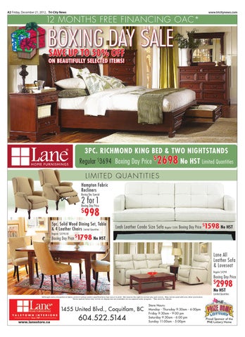 3PC. RICHMOND KING BED & TWO NIGHTSTANDS Regular $3694 Boxing Day Price $2698 No HST Limited Quantities LI MI T ED QU A NT I T I ES Hampton Fabric Recliners Boxing Day Special