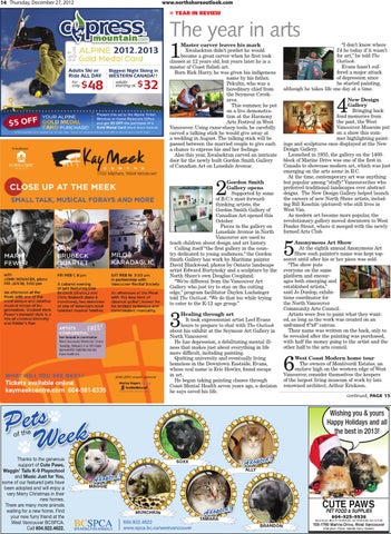 Supported by some of B.C.’s most forwardthinking artists, the Gordon Smith Gallery of Canadian Art opened this October. Pieces in the gallery on Lonsdale Avenue in North Vancouver are used to teach children about design and art history. Calling itself “the first gallery in the country dedicated to young audiences,” the Gordon Smith Gallery has work by Maritime painter David Blackwood, photos by Ontario landscape artist Edward Burtynsky and a sculpture by the North Shore’s own Douglas Coupland. “We’re different from the Vancouver Art Gallery who just try to stay on the cutting edge,” program facilitator Daylen Luchsinger told The Outlook. “We do that too while trying to cater to the K-12 age group.”