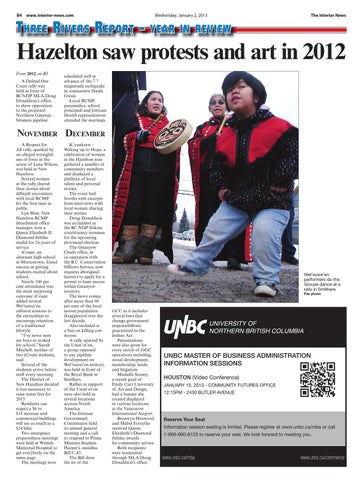 NOVEMBER DECEMBER A Respect for All rally, sparked by an alleged wrongful use of force in the arrest of Lena Wilson, was held in New Hazelton. Several women at the rally shared their stories about difficult encounters with local RCMP for the first time in public. Lyn West, New Hazelton RCMP detachment office manager, won a Queen Elizabeth II Diamond Jubilee medal for 24 years of service. iCount, an alternate high school in Moricetown, found success in getting students excited about school. Nearly 100 per cent attendance was the most surprising outcome. iCount added several Wet’suwet’en cultural sessions to the curriculum to encourage retention of a traditional lifestyle. “I’ve never seen my boys so stoked for school,” Sarah Mitchell, mother of two iCount students, said. Several of the students arrive before staff every morning. The District of New Hazelton decided it was necessary to raise water fees for 2013. Residents can expect a $6 to $18 increase and commercial buildings will see as much as a $24 hike. Two emergency preparedness meetings were held at Wrinch Memorial Hospital to get everybody on the same page. The meetings were