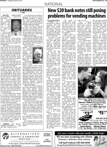 New $20 bank notes still posing problems for vending machines THE CANADIAN PRESS OTTAWA, Ont. Thousands of vending machines still can’t digest those plastic $20 bank notes the government released two months ago, with machine owners blaming the Bank of Canada for their problems. As many as half a million machines that scan bank notes needed reprogramming to accept the radically redesigned $20 bills, the most popular denomination in Canada. Some 145 million polymer $20 notes have been put into circulation since Nov. 7, one of a series of new plastic notes intended to thwart counterfeiters and last much longer than their paper-cotton predecessors. Kim Lockie has been converting his 1,200 machines in Fort McMurray, Alta., fulltime for two months, but still has about 300 to go. His unconverted machines, dispensing chips, candy, ice cream and even overthe-counter pharmaceuticals, are frustrating customers who can’t use their crisp, new bills. “I would think less than half the machines in Canada would accept this bill right now,” says Lockie, the industry’s point man for the conversion project as an official of the Canadian Automatic Merchandising Association. “As a small business, I am losing money.” Lockie blames the Bank of Canada for failing to heed three years of warnings from owners that they needed a long lead time to recalibrate their vending machines before the official release of the new bills.