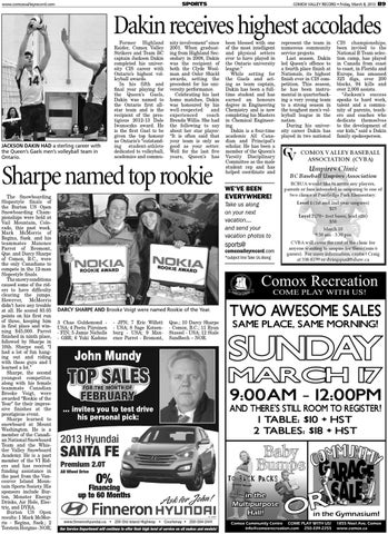 Former Highland Raider, Comox Valley Strikers and Team BC captain Jackson Dakin completed his university CIS career with Ontario’s highest volleyball awards. In his fifth and final year playing for the Queen’s Gaels, Dakin was named to the Ontario first allstar team and is the recipient of the prestigious 2012-13 Dale Iwanoczko award. He is the first Gael to be given the top honour as Ontario’s “outstanding student-athlete dedicated to volleyball, academics and commu-