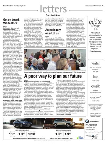 A poor way to plan our future Editor: Re: Project foes, supporters out in force, May 2. What is the actual benefit of the proposed Vidal Street project, if any, to current residents or taxpayers? There is no reason to believe a change of OCP and zoning bylaws to accommodate 12 townhouse units and 97 apartments in this area would contribute to the wellbeing of the community and its new members. Most likely, it would lower the quality of life – more traffic congestion, more noise and air pollution, less green and open space, loss of wildlife habitat and views. Lowering our quality of life is sad enough, but it also increases taxes. To base growth on the ability to milk new residents for tax revenue is a sophism, since additional taxes are needed to pay for services that the new residents would require. We are outraged to see some residents who gained political influence by strongly opposing building up in the town centre five years ago now use said influence to support urban growth beyond limits and destruction of mature trees for personal benefit. Thomas Gessell & Genevieve Loslier, White Rock n The public hearing for a proposed 12-storey building at upper Vidal Street demonstrated the process for approving projects, certainly in this instance, is flawed.