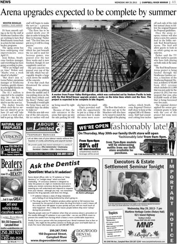 off each side of the rink but instead chose to follow the original Request for Proposal guidelines. Once the arena reopens, visitors will also notice a new, live camera feed in the lobby outside Rod Brind’Amour Arena. The feed will allow guests to look in on what’s going on on rink two. Parker said the TV will be useful to parents who have kids playing on both rinks at the same time. The Rod Brind’Amour Arena project is being funded through the Strathcona Gardens service, a function of the Strathcona Regional District, as follows: $750,400 from 2013 revenue which includes $111,000 that was put aside for the project in 2012 but was unspent that year, plus $328,800 worth of debt that is being borrowed over five years. The regional district applied for senior government grants to help with the cost of the project but none were approved.