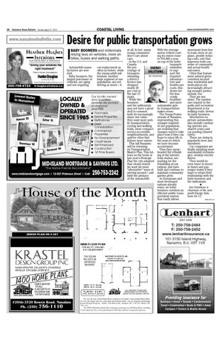 at all. In fact, many With the average young consumers motor vehicle costdon’t care about ing its owner close cars. to $10,000 a year, CUSTOM BLINDS & DRAPERIES In the U.S. and on top of the hefty Canada tax-payer “Giving your windows the Automobile manucar replacement as the persubsidies EnErgy right treatment” facturers are woroften as before, while centage of to supsolutions Free In Home Consultations ried. the young adult milteenagers port the Ian Gartshore Baby boomers, the lennials, another obtaining required largest purchaser of large segment of our a driver’s infrastrucwww.heatherhughesinteriors.ca vehicles, are aging population, are not licence has ture and and not requiring driving as much – if dropped health-care 250-758-4723 h-hughes@shaw.ca nearly 20 costs, this per cent in desire for the last 15 the less Lowest Ra Our locally owned years. costly, tes While the healthier and operated In Nanaim o! boomers and more services are prompt, and the millennials sustainable pubprofessional may not have a great lic transportation and FREE deal in common makes sense. ■ Purchases both do increasingly The Young Profes■ Rental Properties share one value: sionals of Nanaimo, Nanoose ‘85 Saltair ‘91 they want more pub- representing this ■ Refinances lic transportation, younger segment ■ Debt cycling and walking of our population, ALL DESIGNS, PLANS AND RENDERINGS © COPYRIGHT JENISH HOUSE DESIGN LIMITED Consolidation trails, more compact, are realizing that ■ Commercial service-accessible changes need to take Properties neighbourhoods, and place now if they can quieter cities that hope to enjoy life in ■ No Downpayment feature more nature. the ways to which ■ Credit Issues Downtown ‘95 This fall Nanaimo we have become ■ Self Employed will be releasing accustomed. 9 Jinglepot ‘0 ■ Construction its Transportation Thus they spearHarewood ‘9 6 ■ 1st Time Buyers Master Plan. This fol- headed the rebuildALL DESIGNS, PLANS AND RENDERINGS © COPYRIGHT JENISH DESIGN lows onHOUSE the heels of LIMITED ing of the historic last year’s Strategic train station, are Plan the city adopted pushing for the that clearly stated rebuilding of our we want far more railway, and have “The Name Friends Recommend” “alternative” ways of built and continue to moving around – and maintain community www.midislandmortgage.com ❙ 12-327 Prideaux Street ❙ Call ALL DESIGNS, PLANS AND RENDERINGS © COPYRIGHT JENISH HOUSE DESIGN LIMITED limit the primacy garden plots. of the automobile. As Europeans and ALL ALL DESIGNS, DESIGNS, PLANS PLANS AND AND RENDERINGS RENDERINGS © COPYRIGHT JENISH JENISH HOUSE HOUSE DESIGN DESIGN LIMITED LIMITED © COPYRIGHT most developed nations already enjoy, we babyboomers envision an © efficient public transportation system that easily allows