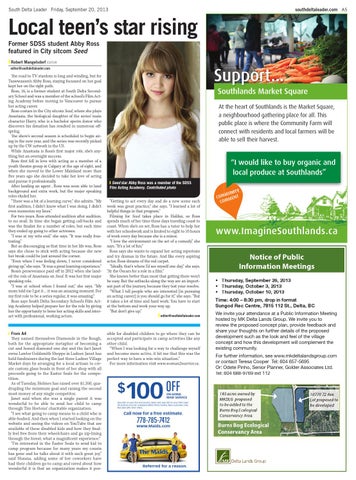 “I would like to buy organic and local produce at Southlands� � Seed star Abby Ross was a member of the SDSS Film Acting Academy. Contributed photo “Getting to act every day and do a new scene each week was great practice,� she says. “I learned a lot of helpful things in that program.� Filming for Seed takes place in Halifax, so Ross spends much of her time these days traveling coast to coast. When she’s on set, Ross has a tutor to help her with her schoolwork and is limited to eight to 10 hours of work every day because she is a minor. “I love the environment on the set of a comedy,� she says. “It’s a lot of fun.� Ross says she wants to expand her acting repertoire and try dramas in the future. And like every aspiring actor, Ross dreams of the red carpet. “Ideally, that’s where I’d see myself one day,� she says. “At the Oscars for a role in a film.� She knows better than most that getting there won’t be easy. But the setbacks along the way are an important part of the journey, because they test your resolve. “What I tell people who are interested [in pursuing an acting career] is you should go for it,� she says. “But it takes a lot of time and hard work. You have to start at the bottom and work your way up. “But don’t give up.�