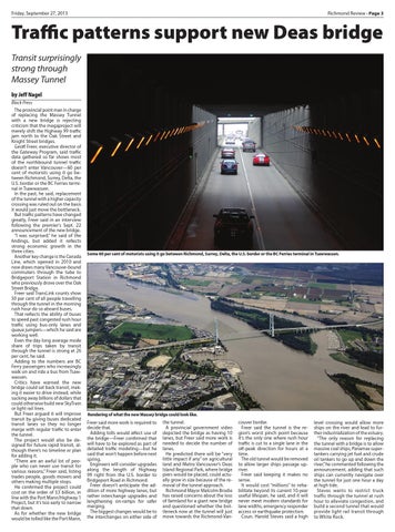 Traffic patterns support new Deas bridge Transit surprisingly strong through Massey Tunnel by Jeff Nagel Black Press The provincial point man in charge of replacing the Massey Tunnel with a new bridge is rejecting criticism that the megaproject will merely shift the Highway 99 traffic jam north to the Oak Street and Knight Street bridges. Geoff Freer, executive director of the Gateway Program, said traffic data gathered so far shows most of the northbound tunnel traffic doesn’t enter Vancouver—60 per cent of motorists using it go between Richmond, Surrey, Delta, the U.S. border or the BC Ferries terminal in Tsawwassen. In the past, he said, replacement of the tunnel with a higher capacity crossing was ruled out on the basis it would just move the bottleneck. But traffic patterns have changed greatly, Freer said in an interview following the premier’s Sept. 22 announcement of the new bridge. “I was surprised,” he said of the findings, but added it reflects strong economic growth in the three cities. Another key change is the Canada Line, which opened in 2010 and now draws many Vancouver-bound commuters through the tube to Bridgeport Station in Richmond who previously drove over the Oak Street Bridge. Freer said TransLink counts show 50 per cent of all people travelling through the tunnel in the morning rush hour do so aboard buses. That reflects the ability of buses to speed past congested rush hour traffic using bus-only lanes and queue jumpers—which he said are working well. Even the day-long average mode share of trips taken by transit through the tunnel is strong at 26 per cent, he said. Adding to the numbers are BC Ferry passengers who increasingly walk on and ride a bus from Tsawwassen. Critics have warned the new bridge could set back transit, making it easier to drive instead, while sucking away billions of dollars that could otherwise build new SkyTrain or light rail lines. But Freer argued it will improve transit by giving buses dedicated transit lanes so they no longer merge with regular traffic to enter the tunnel. The project would also be designed for future rapid transit, although there’s no timeline or plan for adding it. “There are an awful lot of people who can never use transit for various reasons,” Freer said, listing trades people, goods movers and others making multiple stops. He confirmed the project could cost on the order of $3 billion, in line with the Port Mann/Highway 1 Project, but it’s too early to narrow that down. As for whether the new bridge would be tolled like the Port Mann,