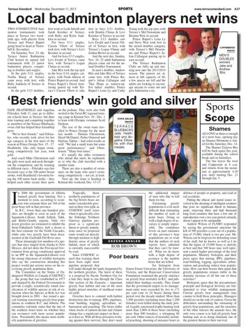 Local badminton players net wins TWO CONSECUTIVE badminton tournaments took place in Terrace two weekends ago, with players from Terrace and Prince Rupert going head to head at Thornhill Jr. Secondary. On Saturday, Nov. 23, the Terrace Junior Badminton Club hosted its annual fall tournament with 23 junior badminton players competing in doubles and singles. In the girls U11 singles, Noella Baerg of Terrace came away with first, with Ruby Jaakkola of Terrace in second. In the girls U13 doubles,