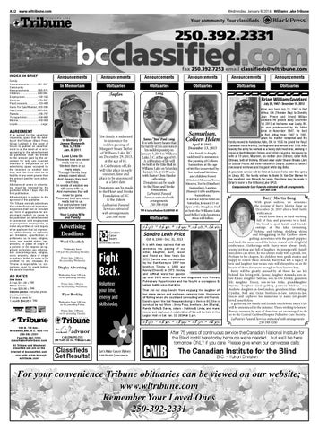 For your convenience Tribune obituaries can be viewed on our website; www.wltribune.com Remember Your Loved Ones 250-392-2331