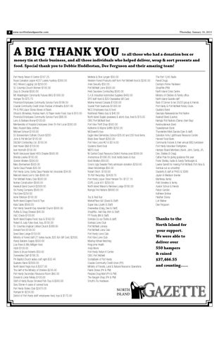 The Port 1240 Radio Rexall Drugs Dunlop’s Home Hardware ShopRite (PM) North Island Crisis Centre Ministry of Children & Family office North Island Gazette staff Barb O’Connor & her 20/20 group & friends Port Hardy & Port McNeill Rotary Clubs Quatsino Band Gwa’sala-Nakwaxda’xw First Nation Kwakiutl Band (Lavina) Namgis First Nations (Diane) (Alert Bay) Kwicksutaineuk Band Tsawataineuk Band Thunderbird Mall (Sandra Dyer & staff) Salvation Army Lighthouse Resource Centre Harvest Food Bank Community Futures & their annual BBQ fundraiser Port Hardy Volunteer Firefighters Hamper Board Members (Kevin, John, Sandy, JR, Don, Debbie & Craig) Cathie Poje for giving guidance this year Frank Shelley, Audie & Sandy Tamburgini & Lawrie Garrett for making Port McNeill, Port Alice & Sointula run so smoothly! Students & staff at PHSS & SD85 Jaylon & Madison Grenier Martineau family Patti Smedley & family Avalon School & friends Robyn Gordon Kathleen Bolivar Heather Storey Lori Walker Dee Ferguson