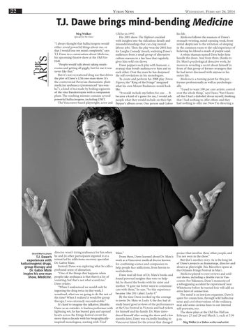 T.J. Dawe brings mind-bending Medicine Cliches in 1997. His 2001 show The Slipknot crackled with insights into the ridiculous details and “I always thought that hallucinogens would misunderstandings that can clog menialeither reveal powerful things about me, or labour jobs. Then the play won the 2001 Just that I would lose my mind completely,” says for Laughs Comedy Award, widening Dawe’s T.J. Dawe in a conversation about Medicine, audiences from a small group of alternative his upcoming theatre show at the Old Fire culture mavens to a fan base that regularly Hall. gives him sold out shows. “People would talk about taking mushDawe peppers each play with humour, a rooms and getting all giggly, but for me it was strategy that bonds audiences to him and to never like that.” each other. Over the years he has deepened But it’s not recreational drug use that drives the self-revelations in his monologues. the plot of Dawe’s 12th one-man show. It’s To create and perform his 2008 play Totem the controversial Peruvian shamanistic plant Figures, the “King of the Fringe” imagined medicine ayahuasca (pronounced “aya-waswhat his own Mount Rushmore would look ka”), a kind of tea made by boiling segments like. of the vine Banisteriopsis with a companion “It would include my father, for one … It plant. The resulting mixture contains several became a kind of a game for me, I would ask powerful hallucinogens, including DMT. people what they would include on their Sgt. The Vancouver-based playwright, actor and Pepper’s album cover. One person said Gabor