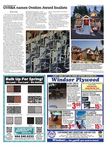 They’re strong supporters of maison d’etre.” Other renovators named as finalists in multiple categories include Best Builders, Sarah Gallop Design Inc., reVISION Custom Home Renovations Inc. and Tavan Developments Ltd. This year’s presenting sponsor is FortisBC. Other sponsors include Black Press and the Homeowner Protection Office, Branch of BC Housing. For a full list of finalists, visit www. ovationawards.ca.