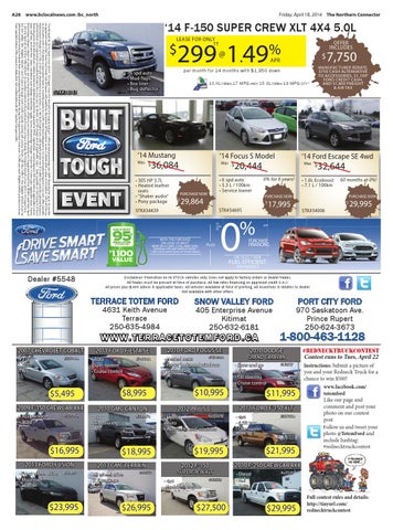 A28 www.bclocalnews.com /bc_north Friday, April 18, 2014 The Northern Connector ††Until April 30, 2014, lease a new 2014 F-150 Super Crew XLT 4x4 with 5.0L engine and get 1.49% annual percentage rate (APR) financing for up to 24 months on approved credit (OAC) from Ford Credit. Not all buyers will qualify for the lowest APR payment. Lease a vehicle with a value of $43,849 at 1.49% APR for up to 24 months with $1,950 down or equivalent trade in, monthly payment is $299, total lease obligation is $9,126 and optional buyout is $22,363. Offer includes Manufacturer Rebate of $7,750, $750 cash alternative to accessories, $1,100 Ford Credit Cash, and freight and air tax of $1,800 but excludes optional features, administration and registration fees(administration fees may vary by dealer), fuel fill charge and all applicable taxes. Taxes payable on full amount of lease financing price after Manufacturer rebates deducted. Additional payments required for PPSA, registration, security deposit, NSF fees (where applicable), excess wear and tear, and late fees. Some conditions and mileage restrictions apply. Excess kilometrage charges 16¢per km F-Series plus applicable taxes. Excess kilometrage charges subject to change, see your local dealer for details. All prices are based on Manufacturer’s Suggested Retail Price. ▲Offer valid from April 1, 2014 to April 30, 2014 (the “Offer Period”) to Canadian residents who purchase fi nance or lease (during the Program Period) a new 2014 F-150 SuperCrew XLT 4x4 (300A) (the “Eligible Vehicle”) and fi nance through Ford Credit Canada Limited will receive CAD$1,100 (the “Offer”). The Eligible Vehicle must be delivered and/or factory-ordered from your participating Ford dealer during the Program Period. Limit one (1) Offer per each Eligible Vehicle purchase or lease. Taxes payable before Offer amount is deducted. Not combinable with BFT Loyalty/Conquest offer.