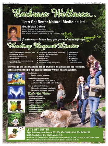 Embrace Wellness... Let’s Get Better Natural Medicine Ltd. Mrs. Brigitte DeFehr HEALER • TEACHER, B.Sc Nutripath Natural Alternative Health Consultant and Reiki Master 30 years experience in the Chilliwack area.