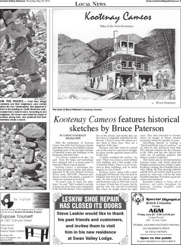 years. They later relocated to Creston, where he taught at Prince Charles Secondary School for another 16 years. Describing himself as leading a “Jekyll-and-Hyde type of existence”, as an artist he also produced more than 330 editorial cartoons for the Advance in the 1990s and has also delved into comic art, oil painting, graphics and fantasy ceramic sculptures. The Creston area is well represented in Kootenay Cameos, with stories about the Midgley murder mystery, Jordan’s Cabin, Kootenay Landing, the Constable barn in Alice Siding, the fruit growing industry and the Town of Creston, which is accompanied by what may well be the most beautiful depiction of Creston’s grain elevators every produced. Kootenay Cameos is being sold at bookstores and outlets throughout the Kootenays, including Kingfisher Used Books in Creston.