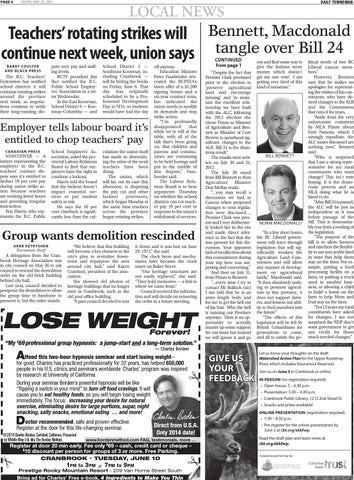Local NEWS Teachers’ rotating strikes will Bennett, Macdonald tangle over Bill 24 continue next week, union says Barry Coulter and Bl ack Press