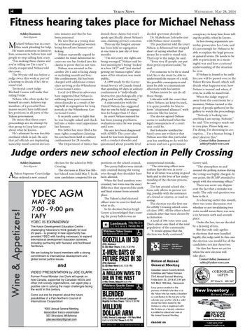 into inmates and that he has been poisoned. He says that as a young man ichael Nehass was in court he witnessed aboriginal women this week pleading for help. being forced into human trafHe wants someone to listen to ficking. him, someone to believe him and Nehass repeatedly argued he people to stop calling him crazy. couldn’t be ruled delusional be“I’m making these claims and cause no one has looked into his you’re telling me I’m crazy,” a claims to prove they’re not true. clearly exasperated Nehass told Nehass was arrested in Dethe court. cember 2011 and is facing chargThe 30-year-old was before a es including assault and forcjudge twice this week as part of ible confinement. He has been a hearing to decide if he’s fit to charged with additional crimes stand trial. since arriving at the Whitehorse Territorial court judge Correctional Centre. Michael Cozens will make that Local civil liberties advocates ruling Friday. have suggested that Nehass is Nehass, who often spoke for suffering from post-traumatic himself in court, believes top stress disorder as a result of bemembers of a powerful Freeing held in segregation for long mason society have infiltrated periods at the Whitehorse Corkey positions in all parts of the rectional Centre. Yukon government. It recently came to light that He insists that these court he was brought naked and shackproceedings are an attempt by led into a video court appearance that group to keep him quiet last January. about what he knows. His father has since filed a huHe’s adamant he was forcibly man rights complaint claiming sterilized while in jail. He says his son has been held in solitary that jail officials are implanting confinement for 28 months. nanochip mind-control devices The Department of Justice has News Reporter