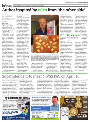 side,â says Hirzer. up. Those anecdotes have Hirzer, 59, retired from evolved for Robert into a his Coquitlam practice last fictional yarn about a poor October but still fills in for family with five children in other doctors when needed. Austria between the world But he doesnât expect heâll wars. be doing another novel The storyline intertwines anytime soon. with those of their âI much prefer the descendants in Canada and writing process to the elsewhere. Hirzer says itâs a marketing process,â says mix of historical romance, Hirzer. âI havenât bet the adventure and mystery. farm on this, and havenât âBy making it fiction quit my day job. Itâs just there are fun getting a few a story out advantages,â there you feel It was a story that just says Hirzer. wasnât told on the other passionate âWith about.â side. fiction you His sister can get into a characterâs loves the book, and his spry head and create more of an 84-year-old mother keeps interest that way. Itâs just âflogging it to her friends,â more readable.â says Hirzer. Hirzer says he was Unfortunately, although also inspired by advice his father knew he New Westminster author was writing a book he Annabel Lyon gave during developed dementia and a talk. died in December at the age âShe said write 200 of 92. words a day. If you follow The soft cover book is that rule you start to layer available at amazon.com things together bit by bit,â and at Renaissance Books says Hirzer. âIt starts to on Sixth Street. Ebook pour out of you.â versions are also available Hirzer worked with at amazon.ca (Kindle) and an editor for six months kobobooks.com (Kobo). to strengthen his novel. An official book launch is He decided to publish it at the New Westminster himself when two of the Public Library on Saturday, five publishing houses he April 12, 3 to 5 p.m. sent the book to went belly