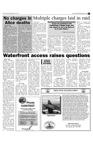 from page 1 identifying, arresting and charging suspected drug traffickers in our communities. If you are involved in the trafficking of illegal drugs, you can expect to see a lot more of us in your future.” As a result of the investigative findings, eight adults are now facing criminal charges, including: • Oliver Walkus, 55, of Port Hardy, is charged with three counts of trafficking cocaine and one count of possession for the purpose of trafficking cocaine; • Aaron Walkus, 21, of Port Hardy, is charged with one count of trafficking cocaine;