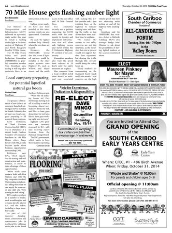 access to the post office and 70 Mile General Store. The committee recently sent a petition requesting the MOTI work with the community to develop and implement infrastructure that will allow safe highway access and travel within the 2.5-kilometre Highway 97 corridor of the community. Committee members also want the speed limit reduced to 70 km/h until the safety measures are in place. One comment from a local resident noted there should be minimal cost associated