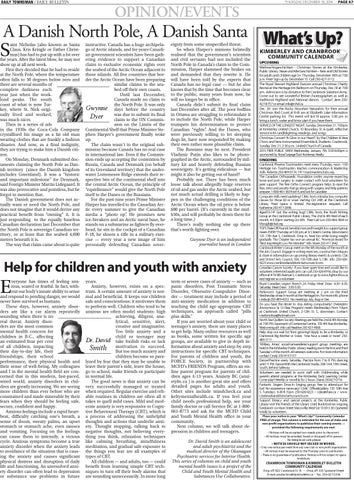 term or severe cases of anxiety — such as panic disorders, Post Traumatic Stress Disorder, Obsessive-Compulsive Disorder — treatment may include a period of anti-anxiety medication in addition to teaching the child age-appropriate CBT techniques, an approach called “pills plus skills.” If you are worried about your child or teenager’s anxiety, there are many places to get help. Many online resources as well as books, some written for specific age groups, are available to give in depth information about anxiety and step-by-step instructions for specific CBT techniques. For parents of children and youth, the FORCE Society, in partnership with MCFD’s FRIENDS Program, offers an online parent program for parents of children ages 4-13 years. Anxiety BC (anxietybc.ca ) is another great site and offers detailed pages for adults and youth. Other sites include mindcheck.ca and keltymentalhealth.ca. If you feel your child needs professional help, see your family doctor or call Service BC at 1-800661-8773 and ask for the MCFD Child and Youth Mental Health office in your community. Next column, we will talk about depression in children and teenagers. Dr. David Smith is an adolescent and adult psychiatrist and the medical director of the Okanagan Psychiatric services for Interior Health. This series of columns on child and youth mental health issues is a project of the Child and Youth Mental Health and Substances Use Collaborative.