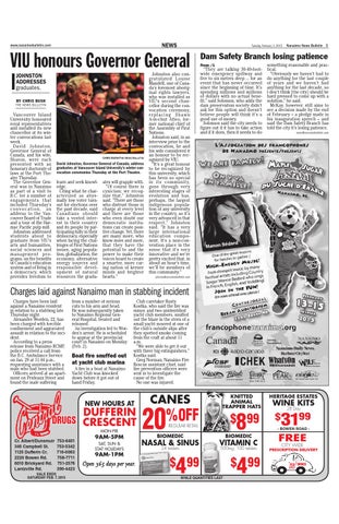 Johnston also congratulated Louise Mandell, one of Canada’s foremost aboriginal rights lawyers, who was installed as VIU’s second chancellor during the convocation ceremony, re p l a c i n g S h a w n A-in-chut Atleo, former national chief of the Assembly of First Nations. Johnston said, in an interview prior to the convocation, he and his wife considered it an honour to be recognized by VIU. “It’s a great honour to be recognized by this university, which has been so special in its community, gone through very interesting stages of evolution and has, perhaps, the largest indigenous population of any university in the country, so it’s very advanced in that respect,” Johnston said. “It has a very large international education component. It’s a non-convention place in the sense that it’s very innovative and we’re pretty excited that, in about an hour’s time, we’ll be members of this community.”