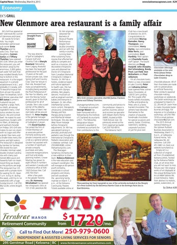 Club has a now board of directors for 2015. Congratulations to commodore Murray Ramsden; Nancy Thompson, vicecommodore; Henry Harlos, rear-commodore; Mike Terris, past commodore; Kent Hardisty, fleet captain and Chantelle Froats, staff captain. The board directors are Doug Harpold, John Sharples, Dot Schoneberg, Randy Prost, Lori Field, Don McEachern and Paul Jollymore. For all chocolate lovers, there is a new chocolatier in Lake Country. Peter and Johanna Johner have opened Peter Johner Swiss Chocolatier, at 12810 Carrs Landing Rd. The couple offer hand-crafted chocolates, truffles and pralines by Peter, who is a Swiss trained chocolatier. The Johners have devoted themselves to the creation of exquisite handmade chocolates for special occasions and events, Easter, Christmas, Valentine’s, wedding, corporate functions or just for your own