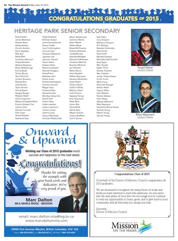 Congratulations Class of 2015 On behalf of the District of Mission, Council congratulates all 2015 graduates. We are honoured to recognize the many hours of study and work you have invested to reach this milestone. As you move into the next phase of your lives we encourage you to continue to seek out opportunities to learn, grow, and to give back to your community and all who help you along your way. Sincerely, District of Mission Council