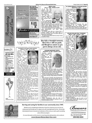 FUNERAL SERVICES & CREMATORIUM LTD. 4060-1st Ave. S.W. Salmon Arm, 833-1129 www.fischersfuneralservices.com Serving Kamloops to Golden Toll Free 1-888-816-1117