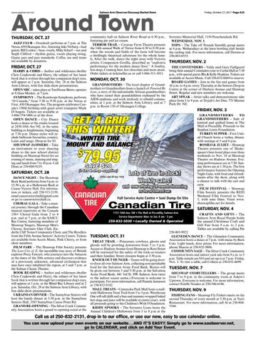 TUESDAY, OCT. 31 TREAT TRAIL – Princesses, cowboys, ghosts and ghouls will be prowling downtown from 3 to 5 p.m. Access to Hudson Avenue from Shuswap to Ross Street will be restricted for the safety of the trick-or-treaters and their families. Street closures begin at 2:30 p.m. KNOCK OUT HUNGER – Teams will be going doorto-door all over Salmon Arm, collecting non-perishable food for the Salvation Army Food Bank. Routes will be given out between 5 and 5:30 p.m. at the Salvation Army Food Bank, 441 3rd St. SW, Salmon Arm (next to the indoor soccer arena.) Everyone is welcome to participate. For more information, call Pamela Jamieson at 250-832-9142. MALL TREATS – Centenoka Park Mall hosts a mallwide Halloween Treat Trail from 3 to 5 p.m. Warehouse One will sell chilli and a bun and mummy-wrapped baked hot-dogs and juice will be available at centre court, with all proceeds going to the Children’s Wish FOundation. KIDDY SPOOKS – The Sorrento Lions hosts the Annual Children’s Halloween from 5 to 8 p.m at the