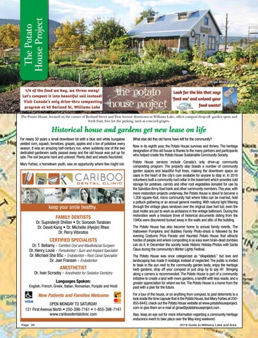 What else did this old home have left for the community? Now in its eighth year, the Potato House survives and thrives. The heritage designation of this old house is thanks to the many partners and participants who helped create the Potato House Sustainable Community Society. Potato House services include Canada’s only drive-up community composting program. The property also boasts a number of community garden spaces and beautiful fruit trees, making the downtown space an oasis in the heart of the city’s core available for anyone to stop in. In 2016 volunteers built a community root cellar in the basement which provides cold storage for potatoes, carrots and other root vegetables donated for use by the Salvation Army food bank and other community members. This year, with more restoration projects underway, the Potato House is about to become a 1,200 square-foot, micro community hall where folks can be married, hold a potluck gathering or an annual general meeting. With natural light filtering through the vintage glass windows over the original claw foot tub, even the dust motes are put to work as ambiance in the vintage bathroom. During the restoration work a treasure trove of historical documents dating from the 1940s were discovered tucked away in the walls and attic of the building. The Potato House has also become home to annual family events. The Halloween Pumpkins and Bubbles Family Photo-shoot is followed by the evening Costume Prize Parade and Haunted Potato House that attracts hordes of people and where composting is so easy even brain-dead zombies can do it. In December the society hosts Historic Holiday Photos with Santa Claus during the community’s Winter Lights Festival. The Potato House was once categorized as “dilapidated,” but love and landscaping has made it nostalgic instead of neglected. The public is invited to bask in the sun next to the community garden beds, enjoy the heritage herb gardens, drop off your compost or just drop by to say Hi! Bringing along a camera is recommended. The Potato House is part of a community initiative to create a land with more gardens, a landfill with less waste, and a greater appreciation for where we live. The Potato House is a home from the past with a plan for the future. For a tour of the house, or on anything from compost, to pest deterrents to a look inside the time capsule that is the Potato House, text Mary Forbes at 250855-8443, check out the Potato House website at www.potatohouseproject. com or give them an e-mail at grow@potatohouseproject.com . Also, keep an eye out for more information regarding a community heritage endurance event to take place over the May-long weekend. 2018 Guide to Williams Lake and Area