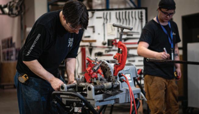 The training space has a fully outfitted sheet metal fabrication machine shop with slip rollers, bench brake machines, hand rotary machines and multiple cutting machines. Students can work and learn at individual installation stations for piping, ducting and equipment. When you add all of that to an adjoining formal classroom setting, the union has built a welcoming, state-of-the-art spot to set down roots and develop new apprentices.