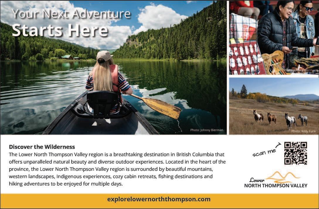 endless shorelines, while our rivers boththrillandsooth.Fromthe“licorice sticks” (remnants of burnt trees from the wildfire in 2003) and rolling hills of Fishtrap Canyon through the mountains as they climb higher and higher and wonder at the exceptional landscapesonofferuntilyoureachthe stunningvistaofMountRobson.Drink inthespectacleof42namedwaterfalls inWellsGrayProvincialPark,featuring Canada’s fourth-highest waterfall, Helmcken Falls, as breathtaking in winter as it is in summer. Our beauty lies in our diversity, and it’s all here in theNorthThompsonValley.