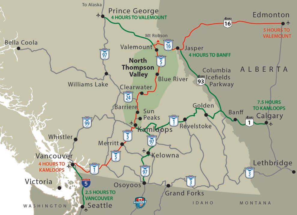 Kamloops,thennorthonHighway5.FromVancouver,take Highway1eastuntilHope,whereyou’llconnectwithHighway 5anddrivenorth.