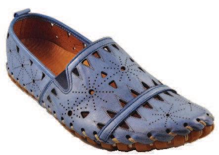 Spring Step Fusaro-Blue. European influenced, leather slip-on loafer, featuring geometric laser cutouts and etching with incorporated stretch elastic.