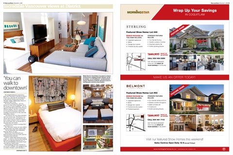 The neighbourhood is expected to grow into Vancouverâs vibrant art district, Jensen says, and adds the development is also just five blocks away from the Olympic Village (Millennium Water) at southeast False Creek. The homes themselves â 103 residences in a nine-storey building, 148 in the second, 10-storey building â were designed by IBI/HB Architects and Portico (interior design). Like the community it is located in, the project reflects the merging of old and new in the materials and colours chosen. âThe interiors are very clean and plain and raw,â Jensen says. Homebuyers can choose between two contemporary interior colour schemes (âoakâ or âwalnutâ), but in the main, they can decide how to decorate their new home. âHomeowners can go in and put their own stamp on it.â The Vancouver homes are more affordable than many may think, Jensen adds. âWe are drastically more affordable than the others,â he says. Studios start from $235,000; onebedroom homes from $275,000, and two bedrooms from $399,000. District: South Main homes are in demand â so much so that the first building sold out on opening weekend (Oct. 3). The second building is now about 50 per cent sold out, Jensen notes. Both buildings will have common areas on their rooftops, each equipped with an outdoor fireplace, patio furniture, a CONTINUED ON P.11