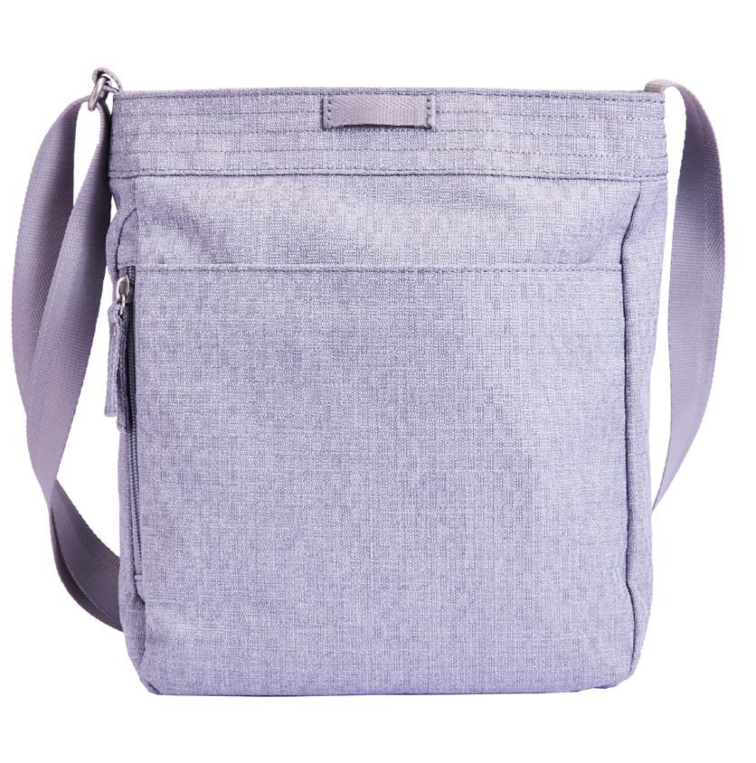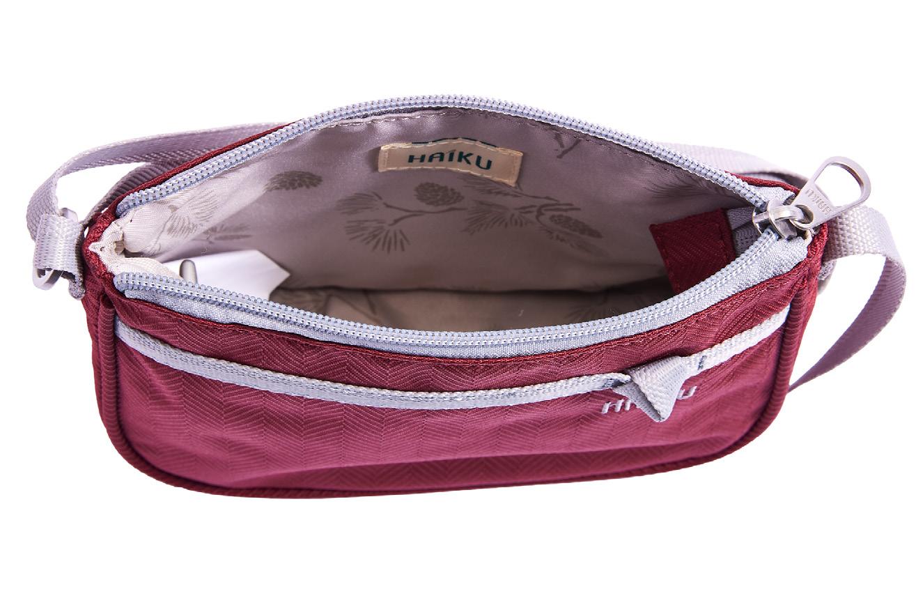 Minimalist on the outside, feature rich on the inside, the double- compartment Bliss quickly expands to hold your wallet, notebook, and even a light sweater. The back zipper compartment secures your most precious items, while the front compartment gives you quick access on the move. It has three pockets (exterior slip, exterior zip, interior zip), an RFID-blocking interior card pocket, a key fob, and an adjustable shoulder strap.