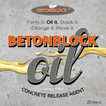 De Betonblock® olie: een eigen label voor de Betonblock® bekistingsolie wat ervoor zorgt dat er geen hechting plaatsvindt tussen het verharde beton en de bekisting.