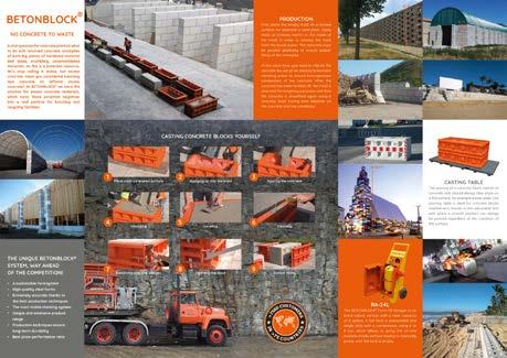 BETONBLOCK® HUISSTIJLUITINGEN BROCHURE De Betonblock® brochure is beschikbaar in zes talen: EN, DE, FR, ES, NL en IT. 9 betonblock.com Concrete block molds. Form it. Stack it. Change it. Move it. >750 U MERS N >7 C U T ES BETONBLOCK® Unique and extensive product range WAY AHEAD OF THE COMPETITION! base material with lot of great uses today. In both cases, System So Special? thanks to the studs on the top and recesses the base of the blocks. This stability increases construction opportunities Many concrete companies focus mainly on producing The blocks lend itself perfectly for dividing/retaining walls products to facilitate ef ciency and cost effectiveness at building sites. Sustainability and product innovation So let us help to process any type concrete you might vital question for concrete plants what to do with returned concrete, stockpiles of both big pieces of hardened 1 2 3 4 5 6 9 7 8 Output ready Removing pins and wedges Opening the mold the block easier. The concrete must be poured gradually concrete has been leveled off, the mold cleansed for CONCRETE SLAB MOLDS For more products see the next page or spray the oil into multiple molds CASTING TABLE place on a flat surface, for example steel plate. Our casting BBOIL-20L CONCRETE RELEASE Concrete release agent ensures kinds of concrete. The drive unit (230V/115V phase) drives the flexible shaft at speed of only 4.000 rpm. CONCRETE BLOCK MOLDS 180.60.60 150.60.60 150.60.30 180.60.30 150.30.60 180.30.60 120.60.60 For more products see the next page or 150.30.30 180.30.30 competitive shipping rates. production site, the choice for Trumpf laser-, punching- and bending machines was evident. They make for the most CONCRETE SLAB MOLDS FOR CONCRETE SLABS used as paving on industrial premises (on good surface and when industry, the infrastructure and (road) construction sector. Own weight 900 kg Lifting capacity 5000 kg that is casted on its side, needs be turned into the right position. concrete block clamp used to lift the cured to put them in the right place. The concrete block clamp is connected to forklift truck by either the CLA Lifting beam of the hydraulic rotation the concrete blocks can be easily the slab in the upright position. The lifting beam can also be used to place concrete slabs. 1 2 3 4 5 6 7 8 PLACING ANCHORS IN STEPS >750 O R N 7 C N IES Italy & South Oliver Bos Eyssen Koji Ishihara Scanfor photos used to reroute traffic and protect pedestrians. and saves purchasing costs for the customer. boulders and conventional concrete blocks, tended to become dislodged over time by the force of the ocean used as armour unit on breakwaters. tetrapod’s shape designed dissipate the force of incoming waves by create blocks that can be coupled to free rotation angle of 22.5 degrees. can register their business on this site free of charge. desired can also, low cost, be chosen for an advertising banner. SAFETY Concrete blocks are the most simple and effective method